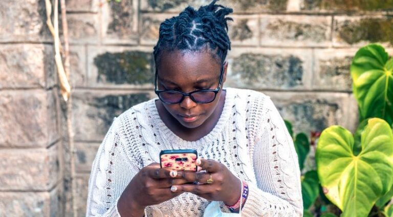 A young man in a brightly patterned shirt checks his phone in a small shop in East Africa, surrounded by goods on shelves — featured in the Jobtech for Refugees Phase 1 report. Learning Study