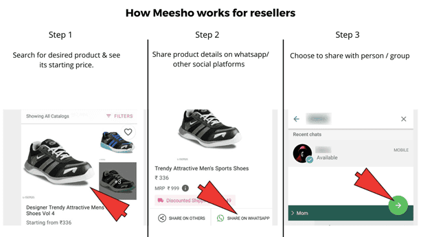 To make money from Meesho, resellers have to share products listed on Meesho on their Whatsapp groups and Facebook pages, earning a commission for every sale made. They can add their commission and shipping charges above the price and when an order gets confirmed, they’ll get notified of the purchase and the margin would then be credited to their bank accounts.